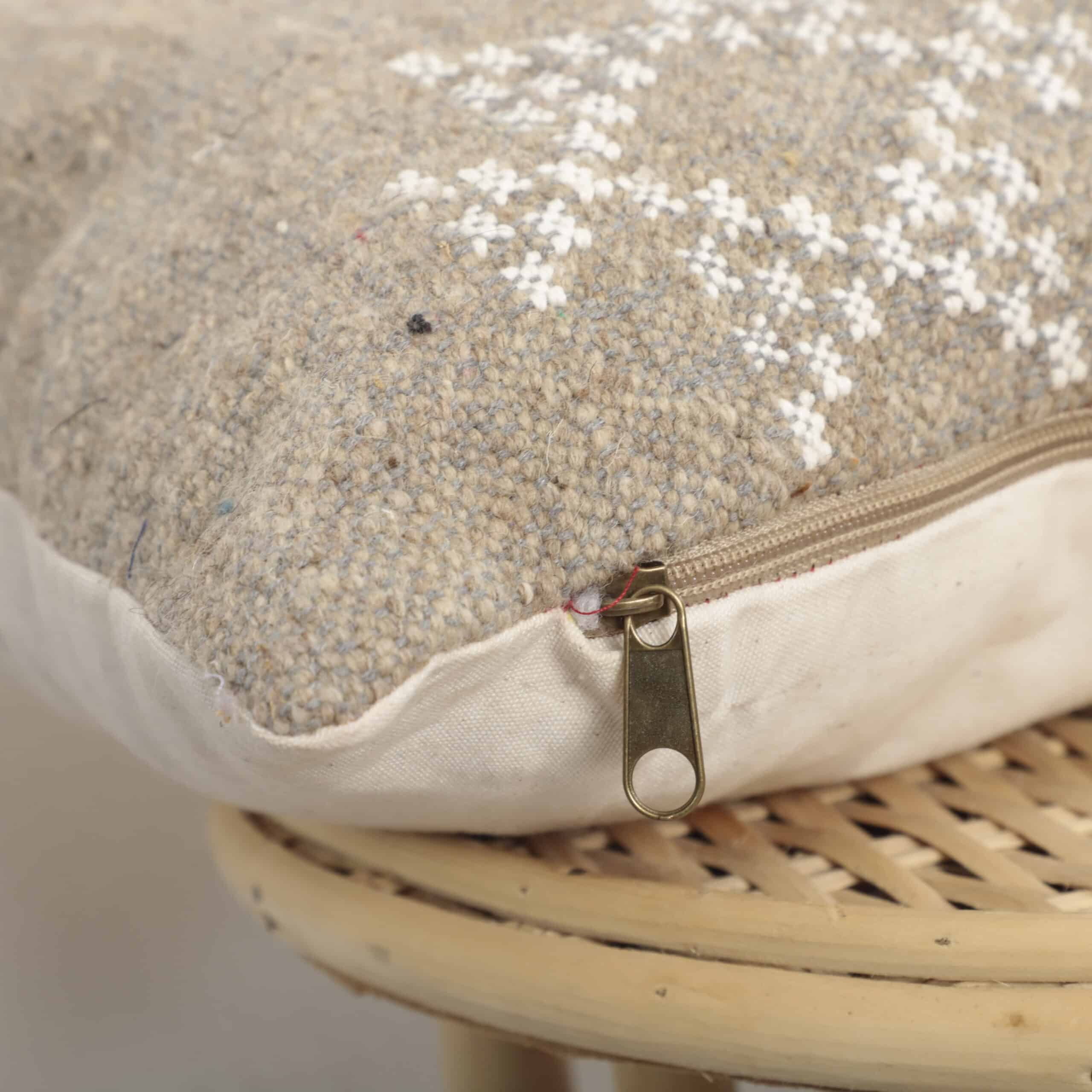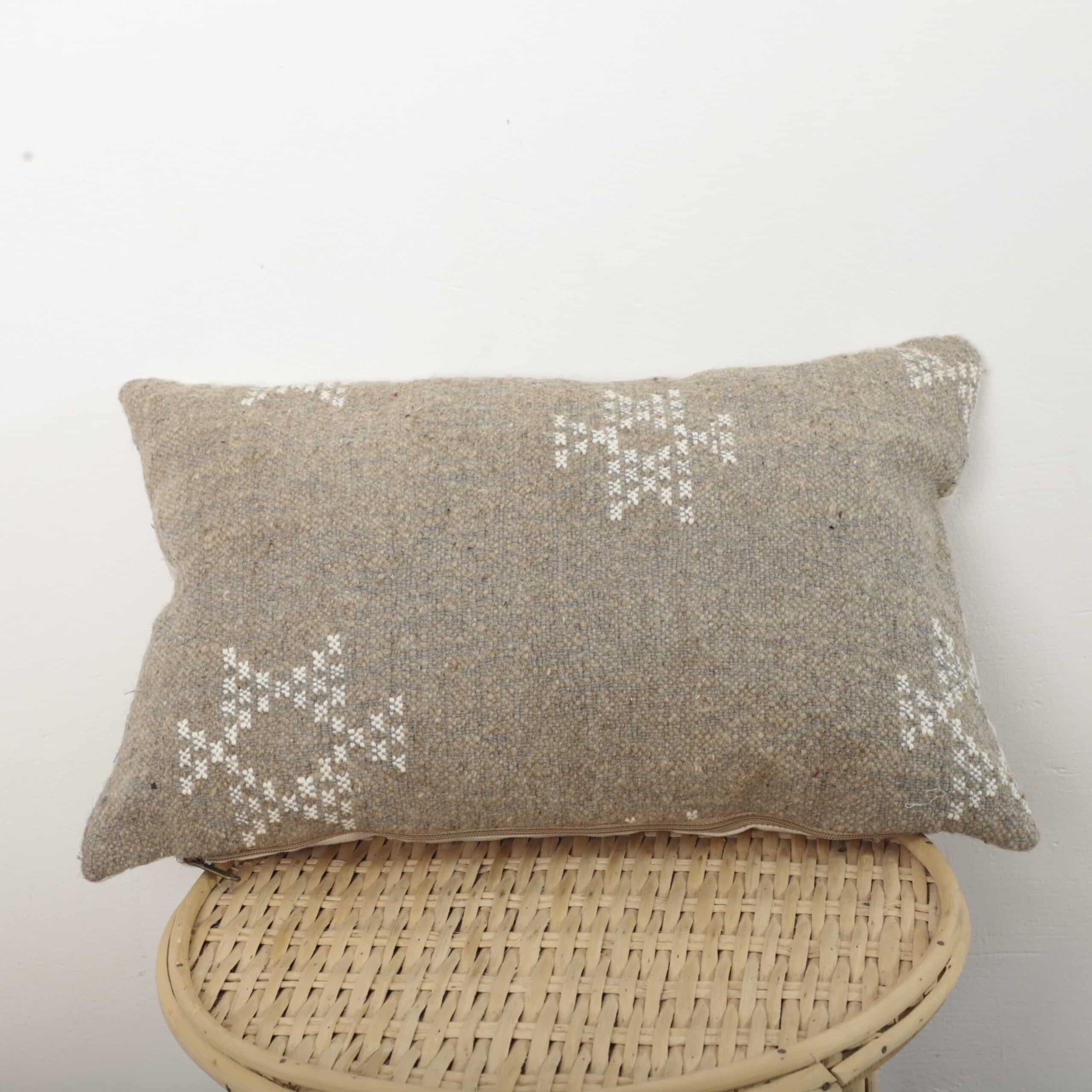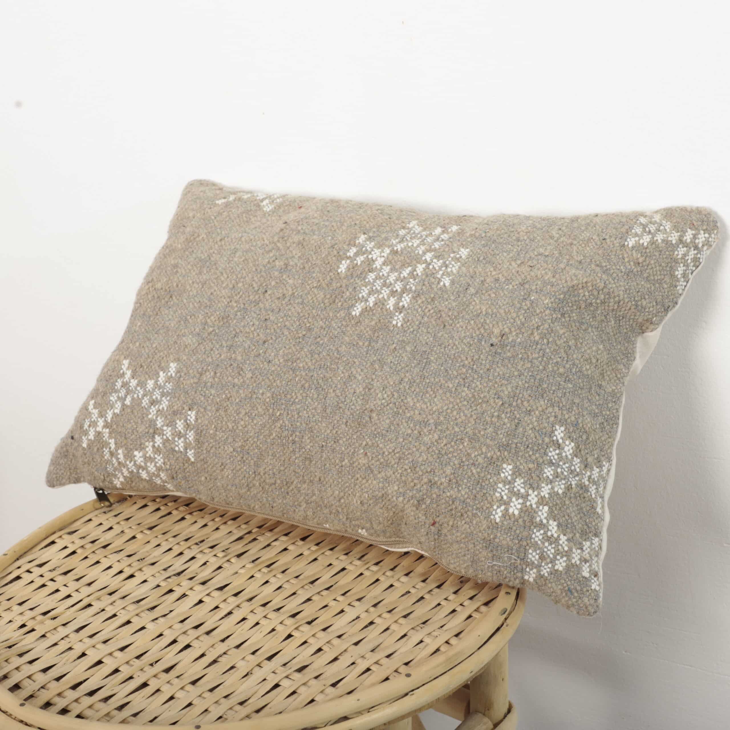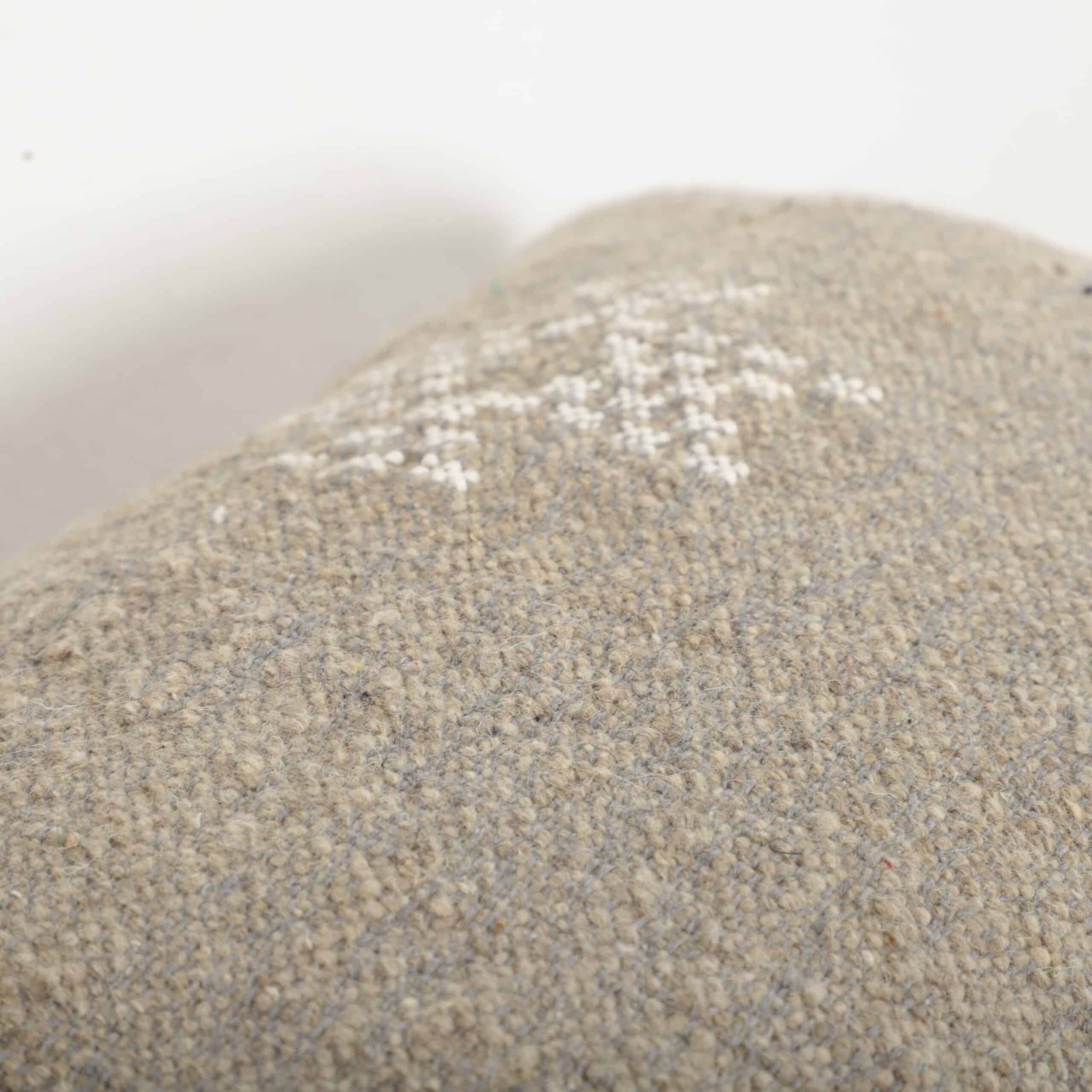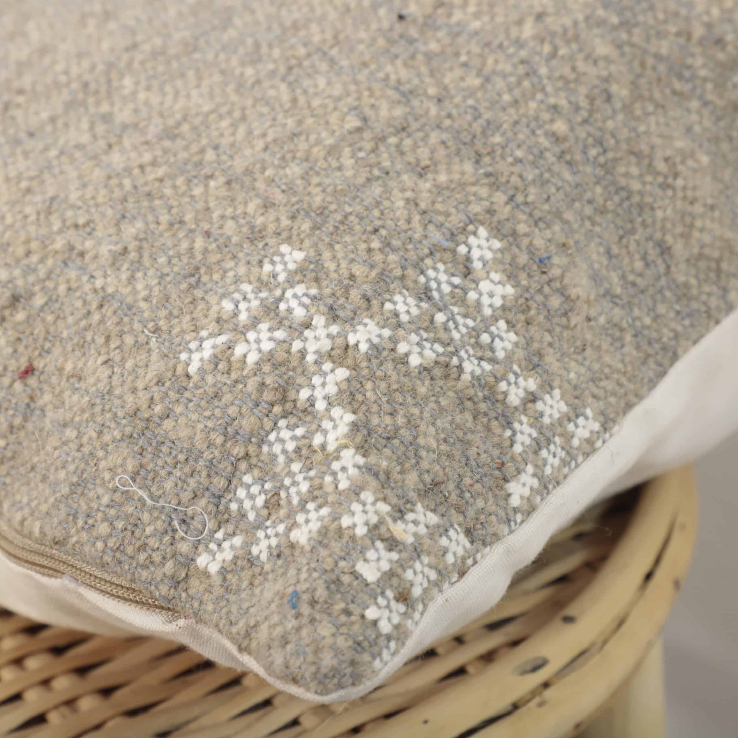 Bring understated elegance and authentic craftsmanship into your home with this Berber Moroccan pillow, handmade using traditional Moroccan weaving techniques. The natural beige tone is complemented by delicate white geometric motifs, inspired by ancestral Berber symbols.