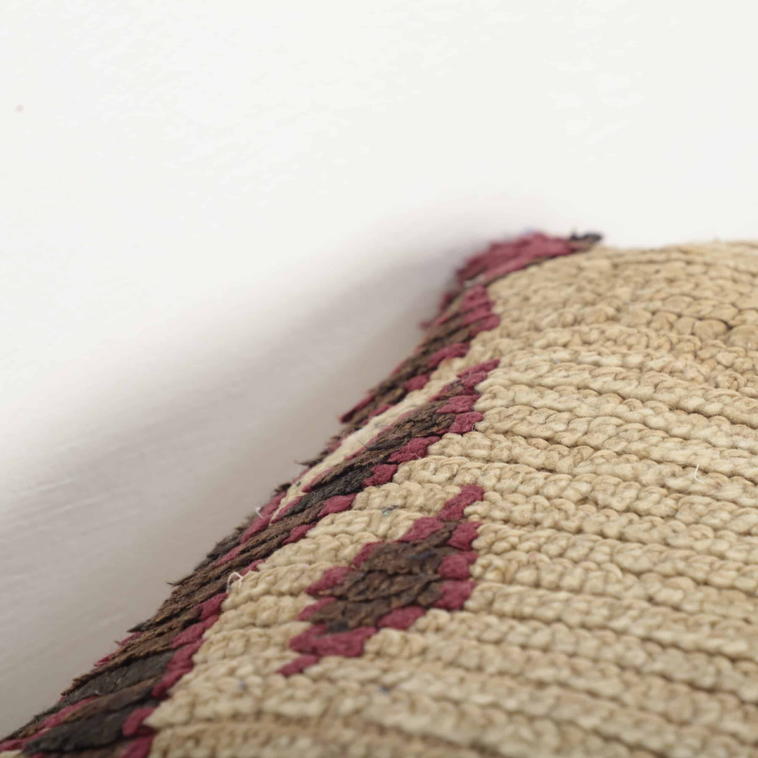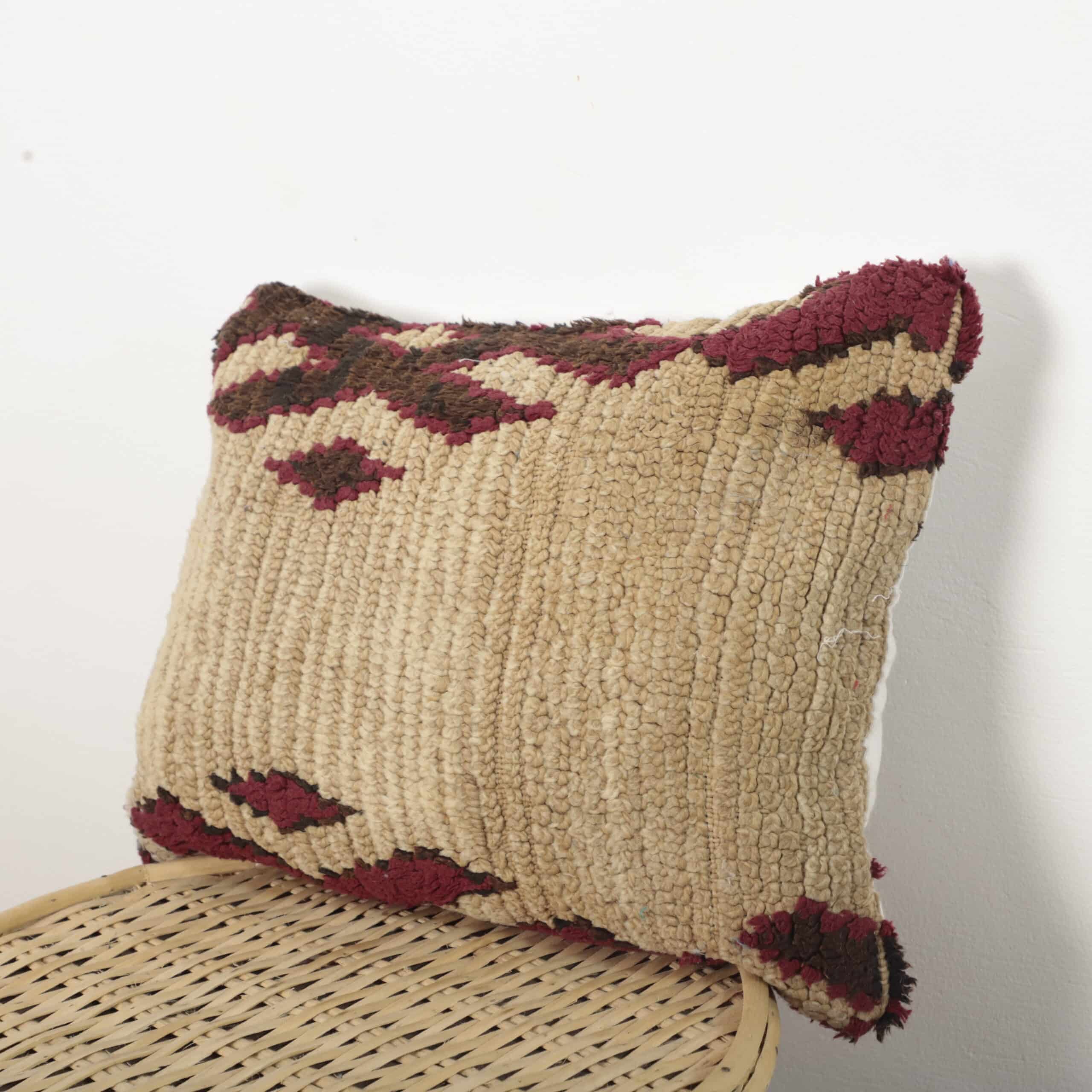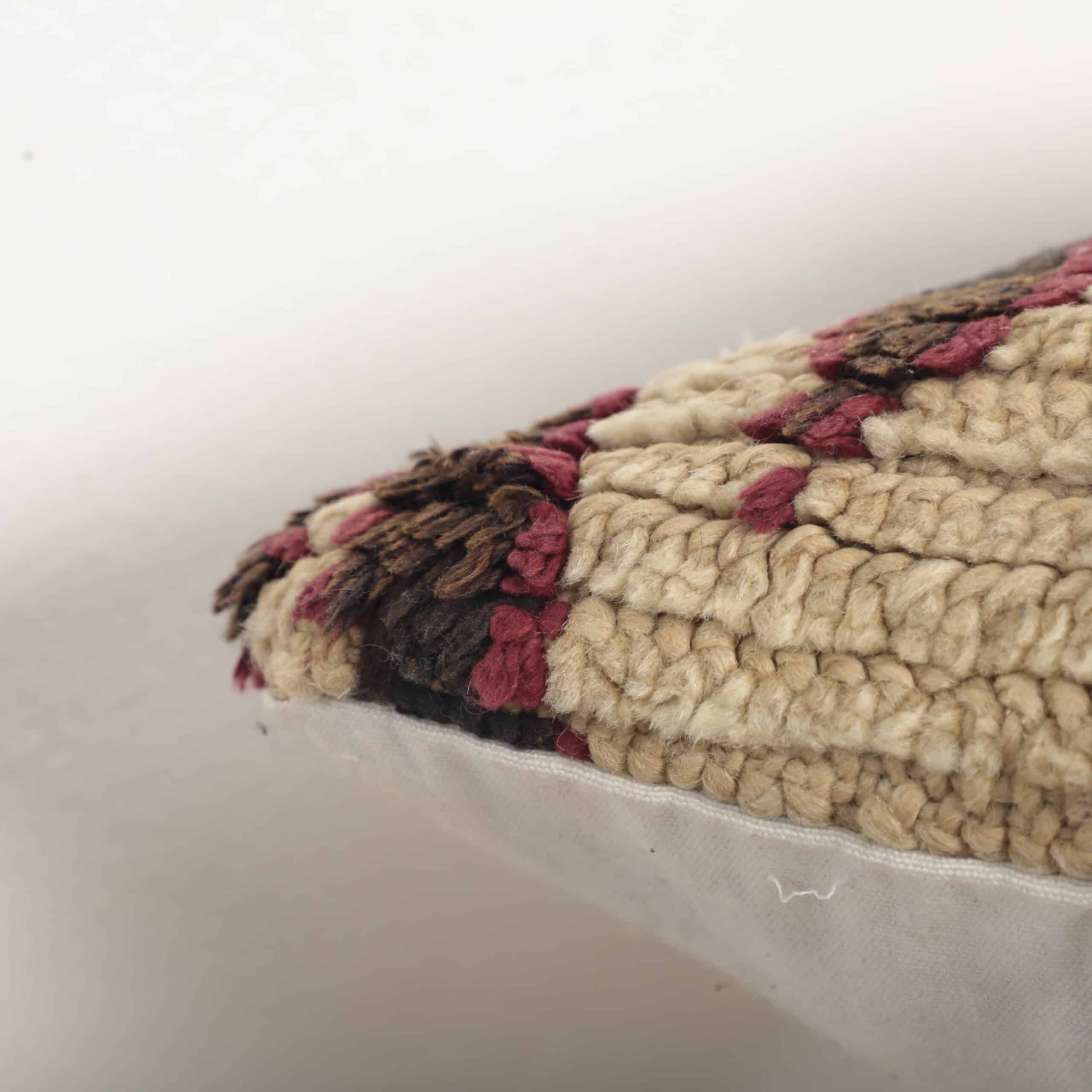 This Berber wool pillow is handmade from authentic vintage Moroccan wool, showcasing the richness of traditional Amazigh craftsmanship. The soft ivory background is beautifully contrasted with deep red and brown woven motifs, creating a warm and timeless design.