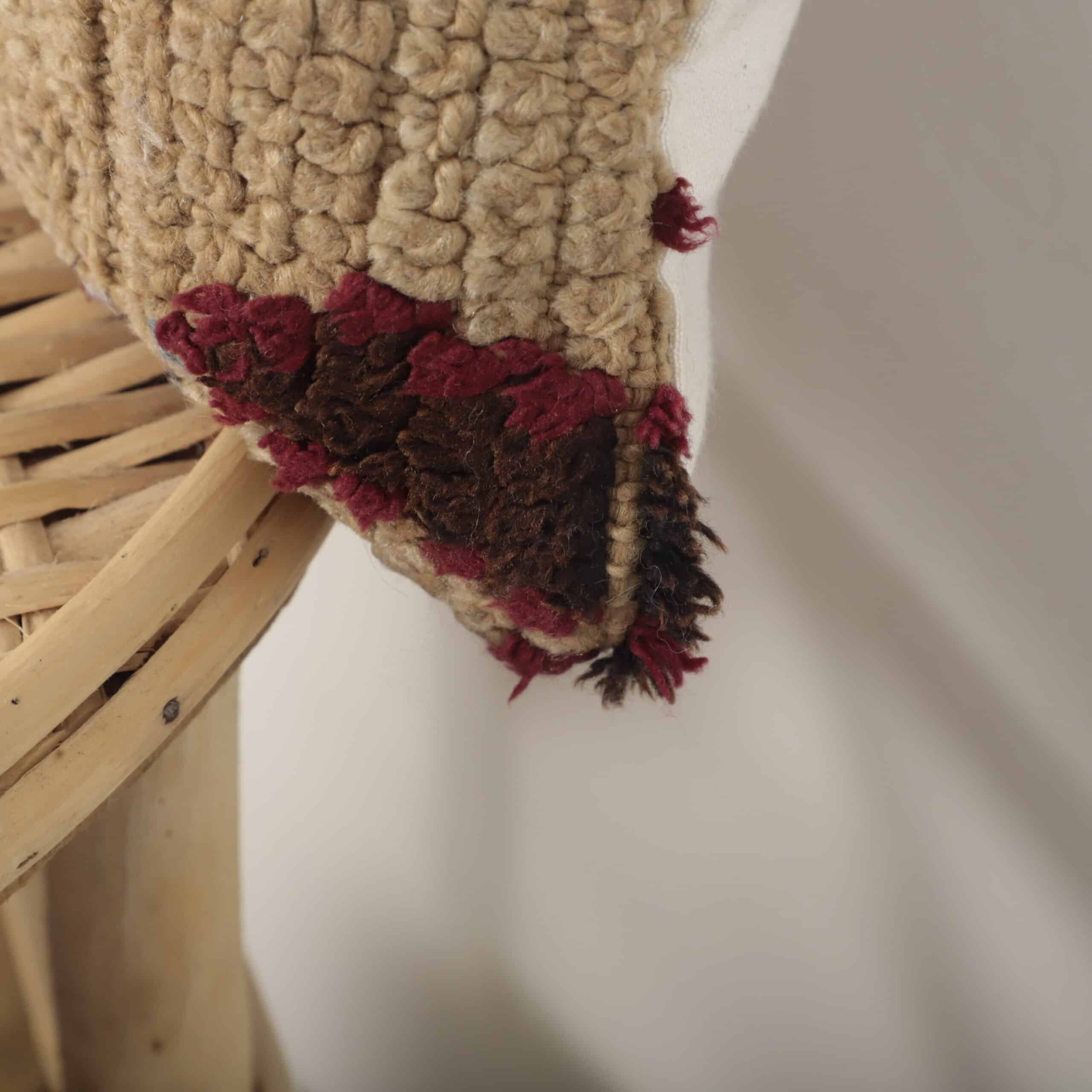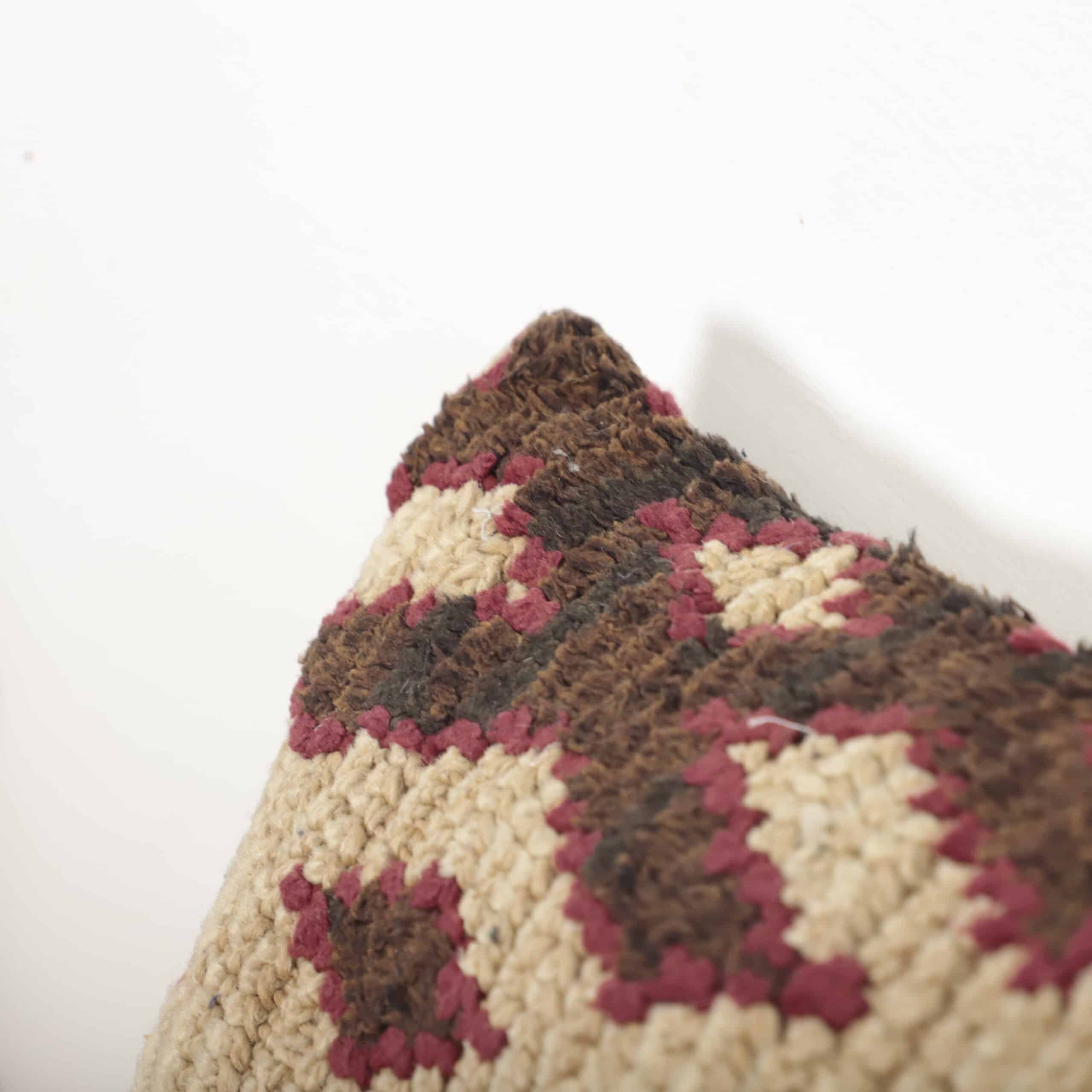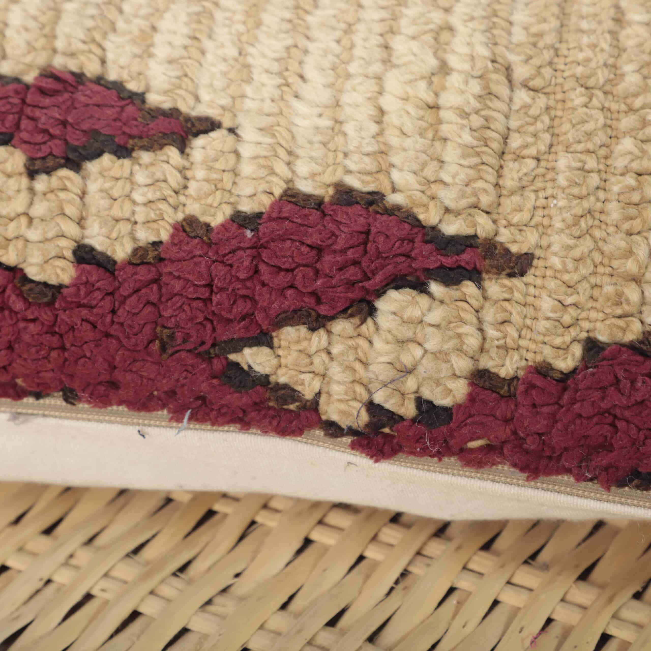 This Berber wool pillow is handmade from authentic vintage Moroccan wool, showcasing the richness of traditional Amazigh craftsmanship. The soft ivory background is beautifully contrasted with deep red and brown woven motifs, creating a warm and timeless design.