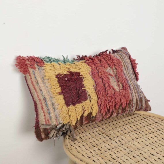 This colorful Moroccan rag rug pillow is perfect as a statement piece, adding artisanal beauty and sustainable craftsmanship to your home decor.