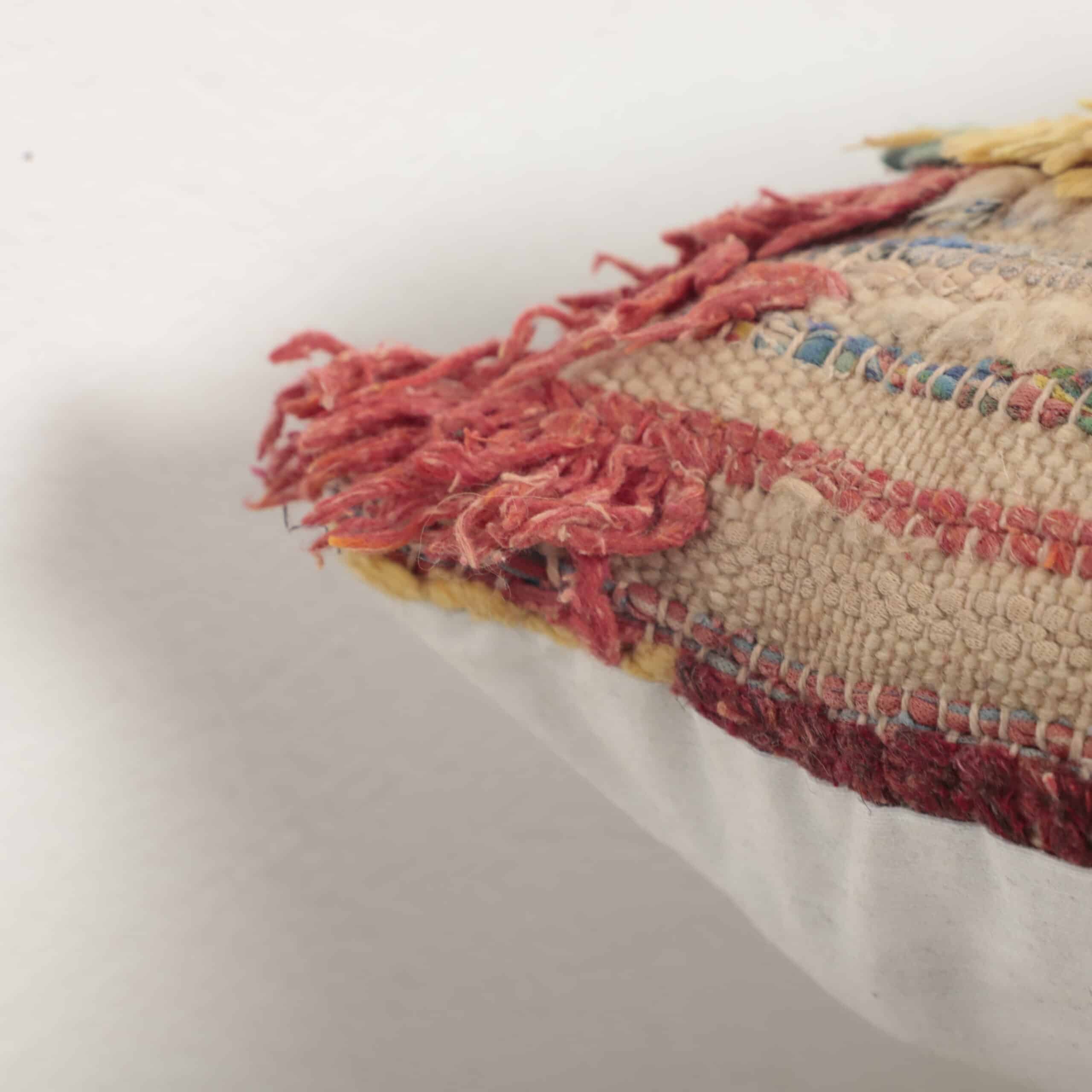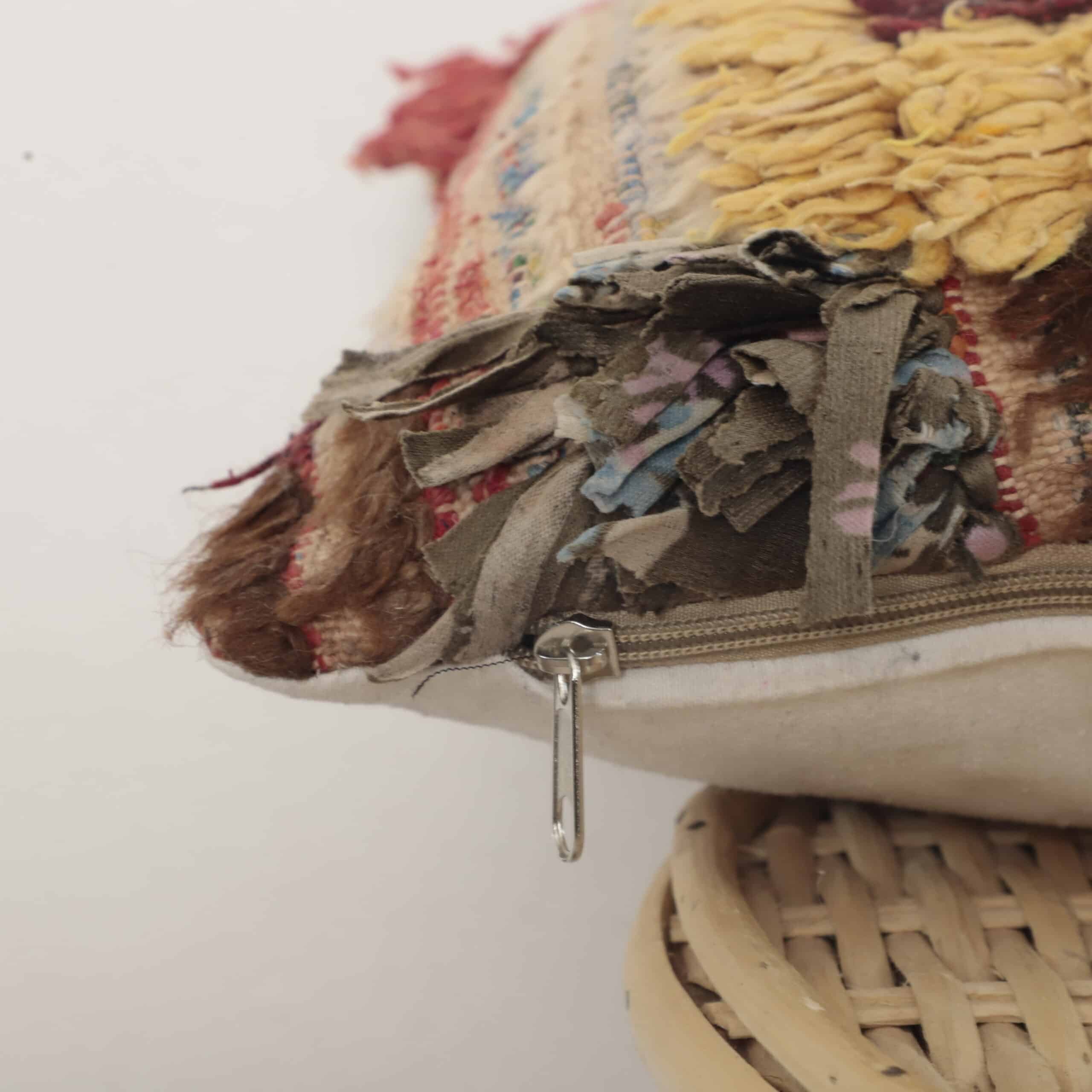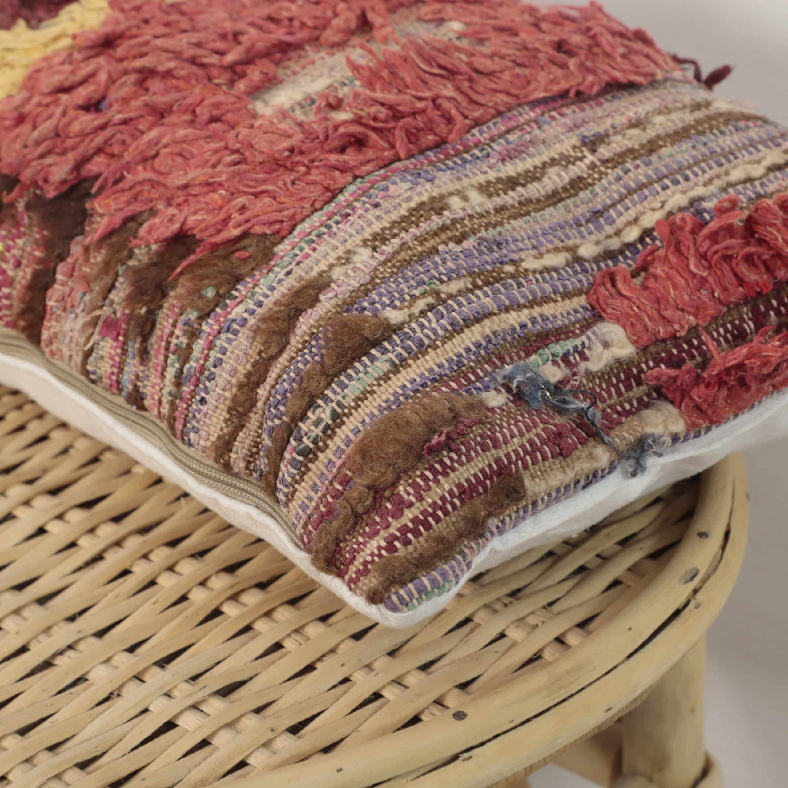 Moroccan boucherouite pillow handmade by Berber artisans in Morocco using traditional recycled textile weaving. This pillow features a shag textured center in deep burgundy and mustard yellow while the sides display colorful striped woven patterns. The mix of textures and rich tones creates a unique artistic look full of depth and character.