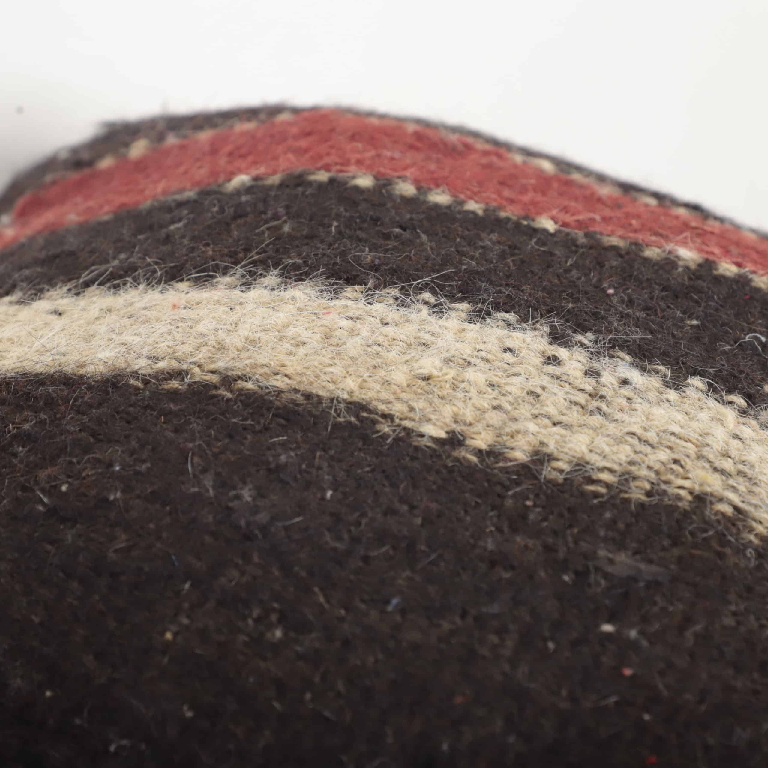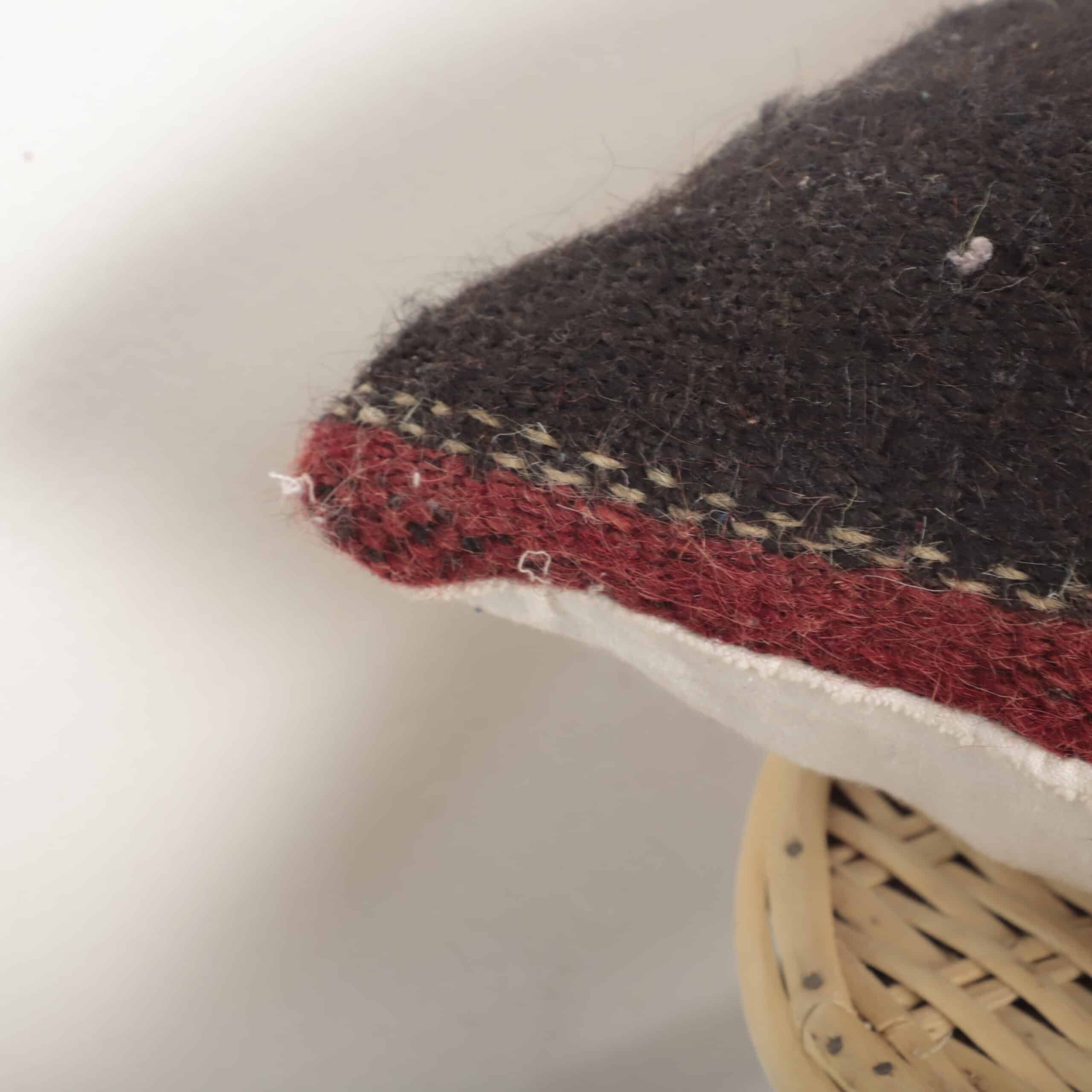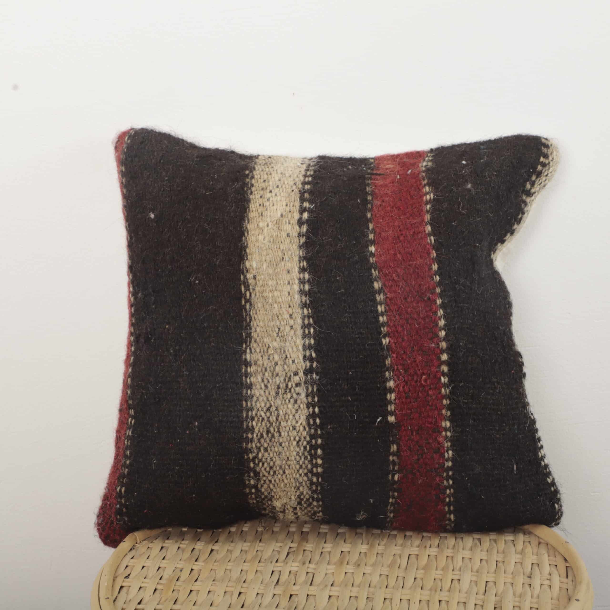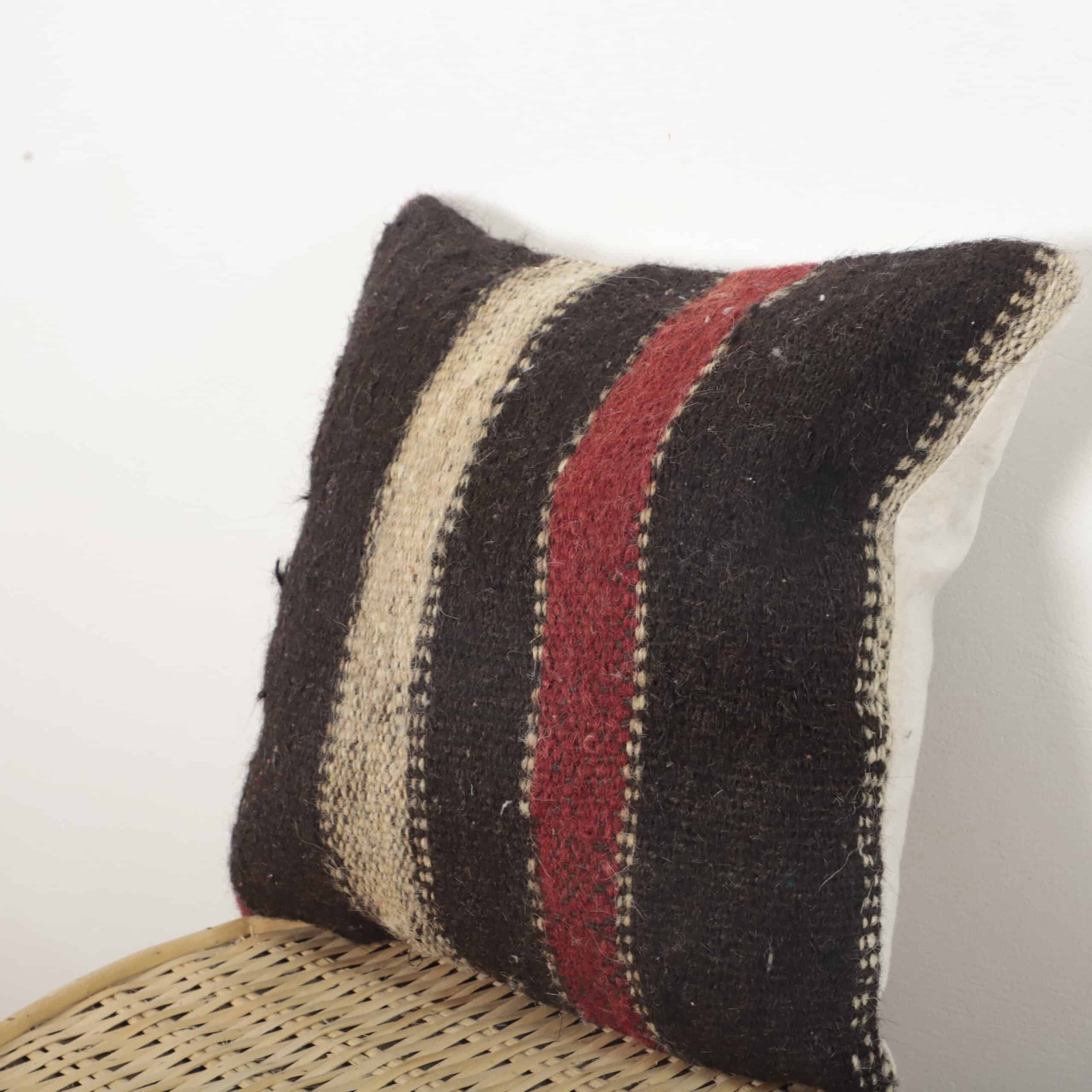This Moroccan kilim pillow is handcrafted from authentic wool textile, showcasing bold vertical stripes in deep black, natural ivory, and rich red tones. The strong contrast and minimalist pattern reflect traditional Moroccan kilim weaving, known for its durability and timeless aesthetic.