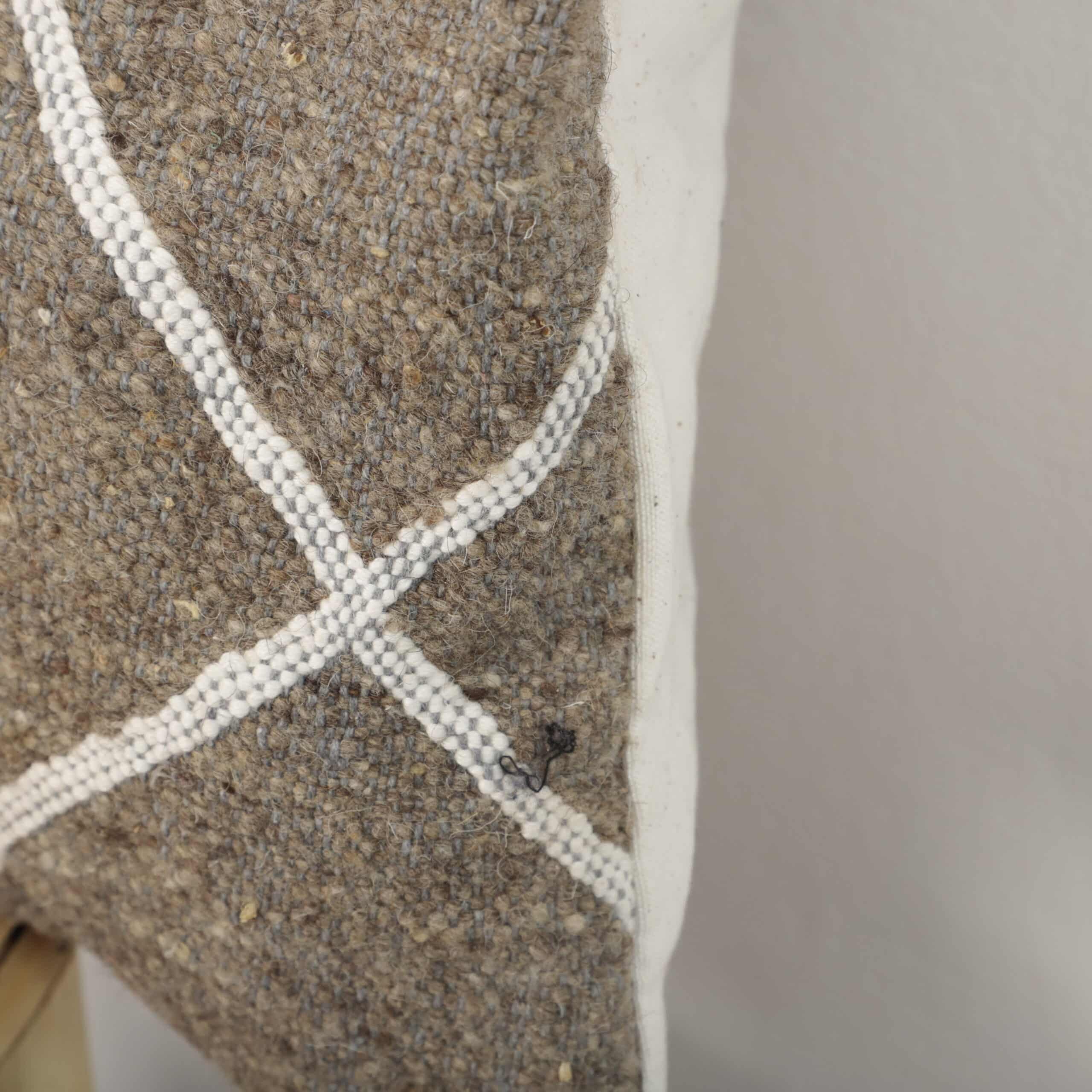 Add understated elegance and authentic craftsmanship to your home with this Moroccan lumbar pillow, handmade from traditional Berber textile. The natural brown wool base is enhanced by simple white linear motifs, creating a calm and refined Moroccan design.