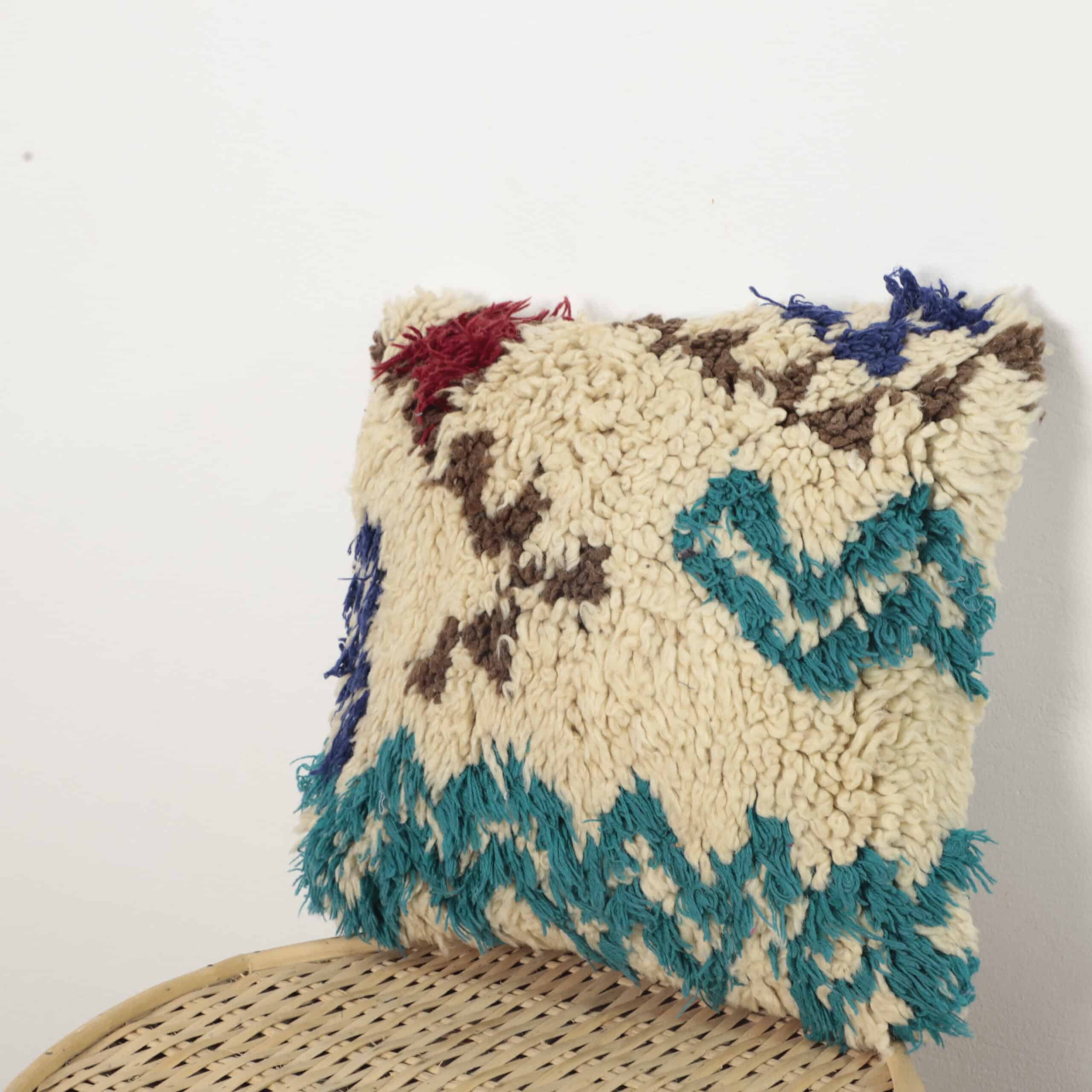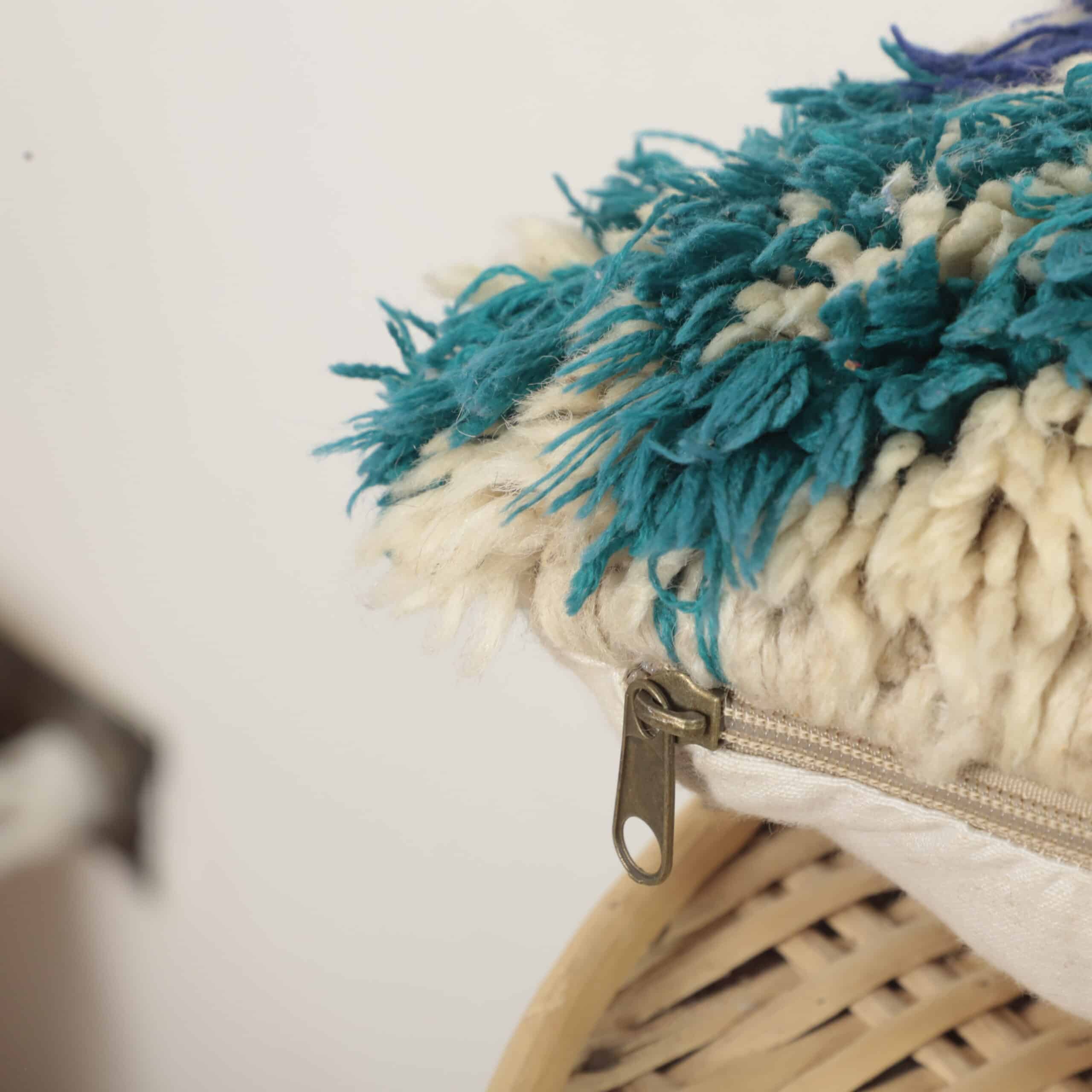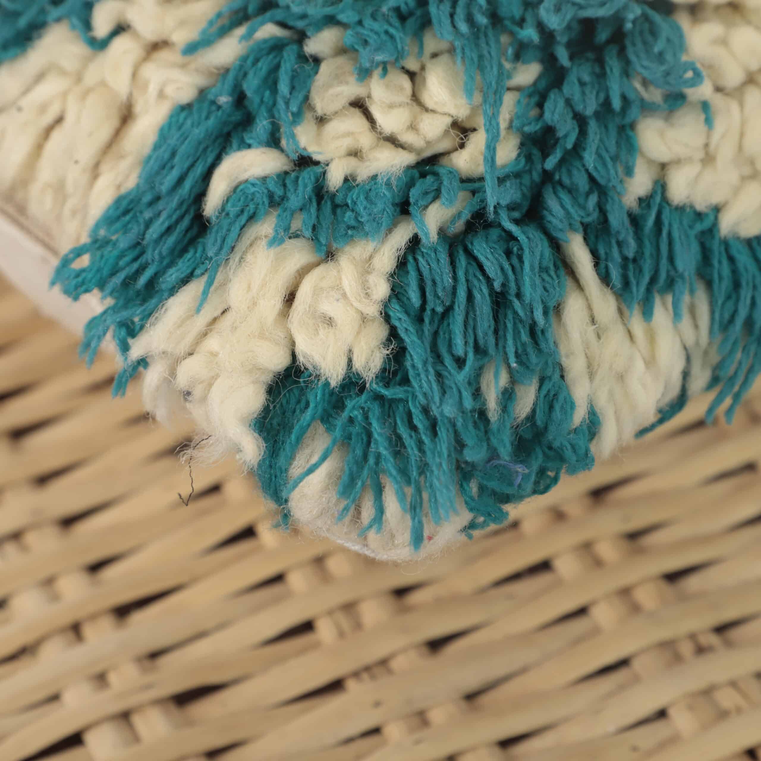 Moroccan shag pillow – Handmade Wool Cushion 36×32 cm Cream with Teal & Blue Boho Pattern
