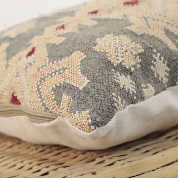 This handmade Moroccan cushion features a comfortable rectangular shape, making it perfect for sofas, beds, benches, or lounge seating. Its neutral color palette blends effortlessly with modern, rustic, boho, and wabi-sabi interiors.
