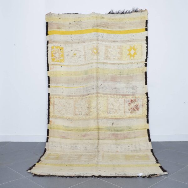 This Vintage Boujaad rug is a handcrafted Moroccan wool piece woven by Berber women in the Haouz region. Measuring 9.3×4.8 Ft (283 x 145 cm), it features symbolic Amazigh motifs and soft textures with naturally faded character developed over time.