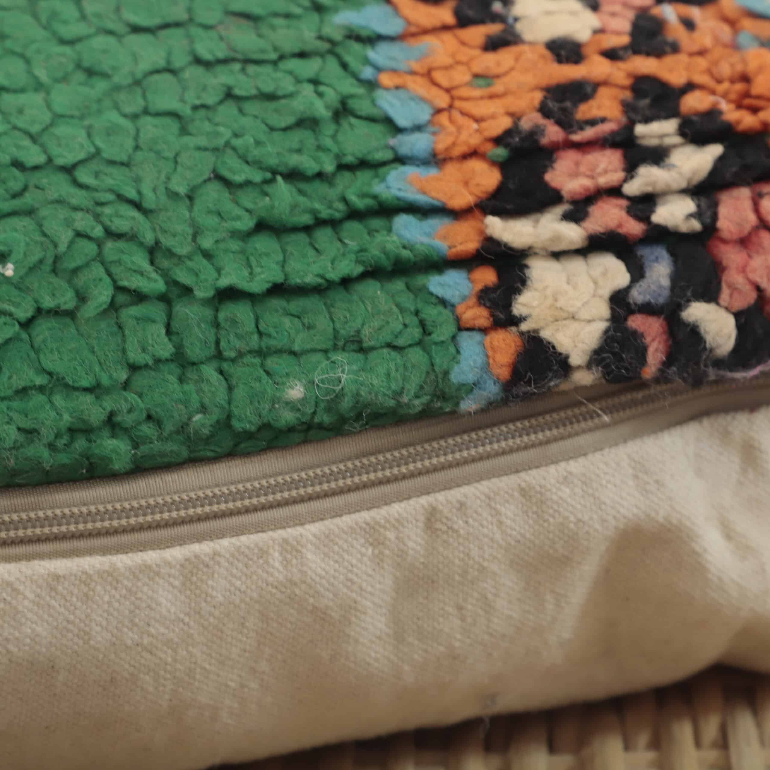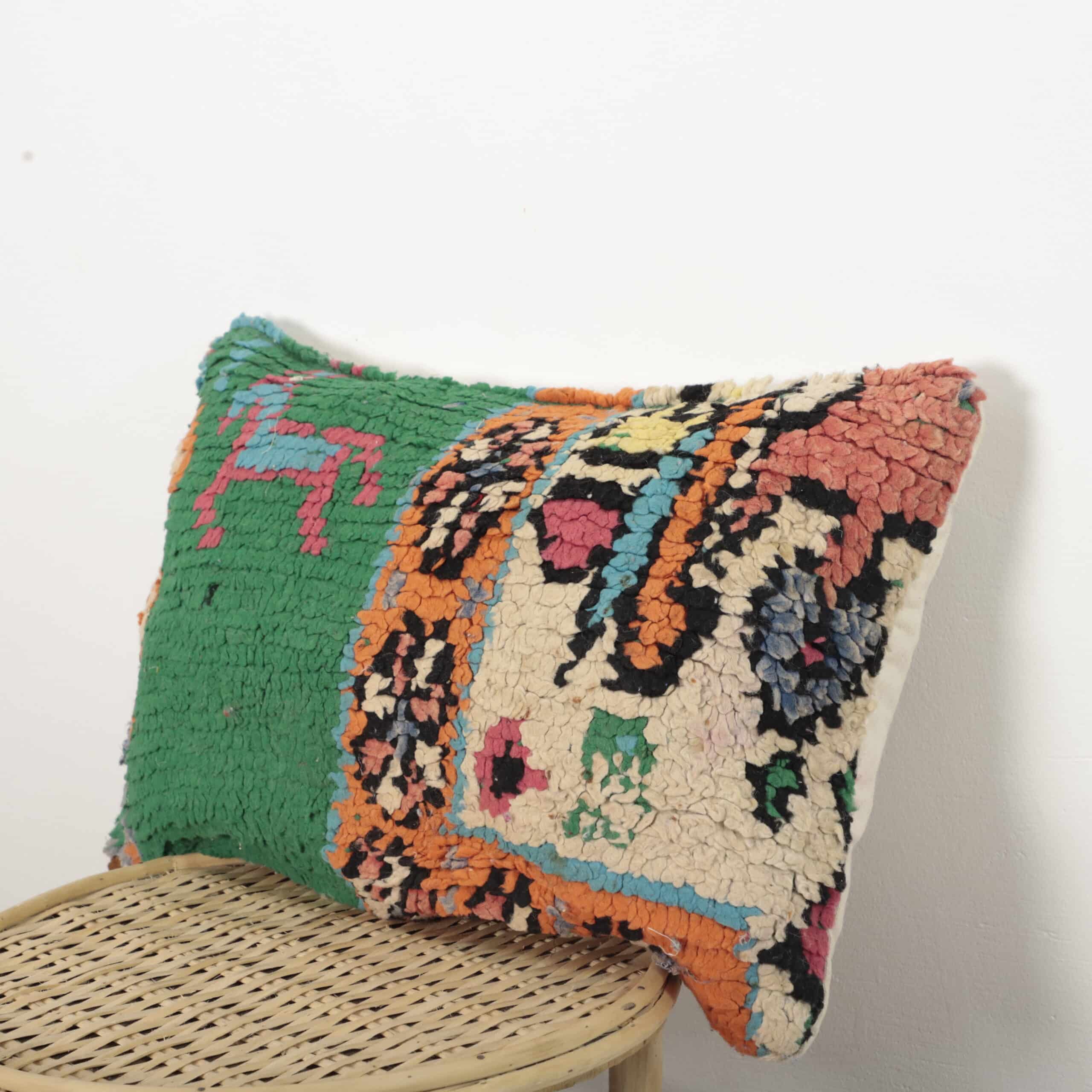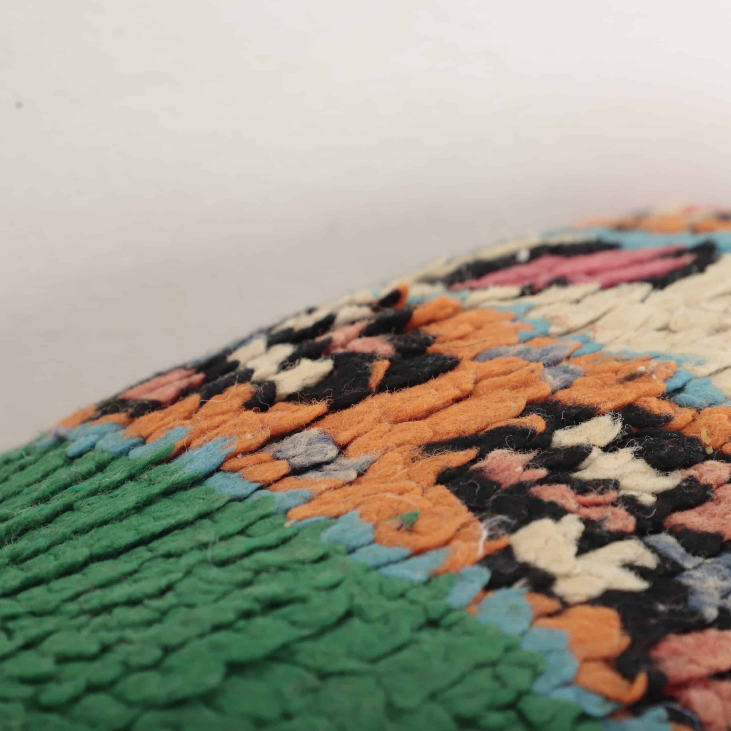 Add bold color and cultural character to your space with this vintage Moroccan pillow, handmade from authentic Berber textile. The design features a striking combination of green, cream, and multicolor geometric motifs, showcasing traditional Moroccan artistry.