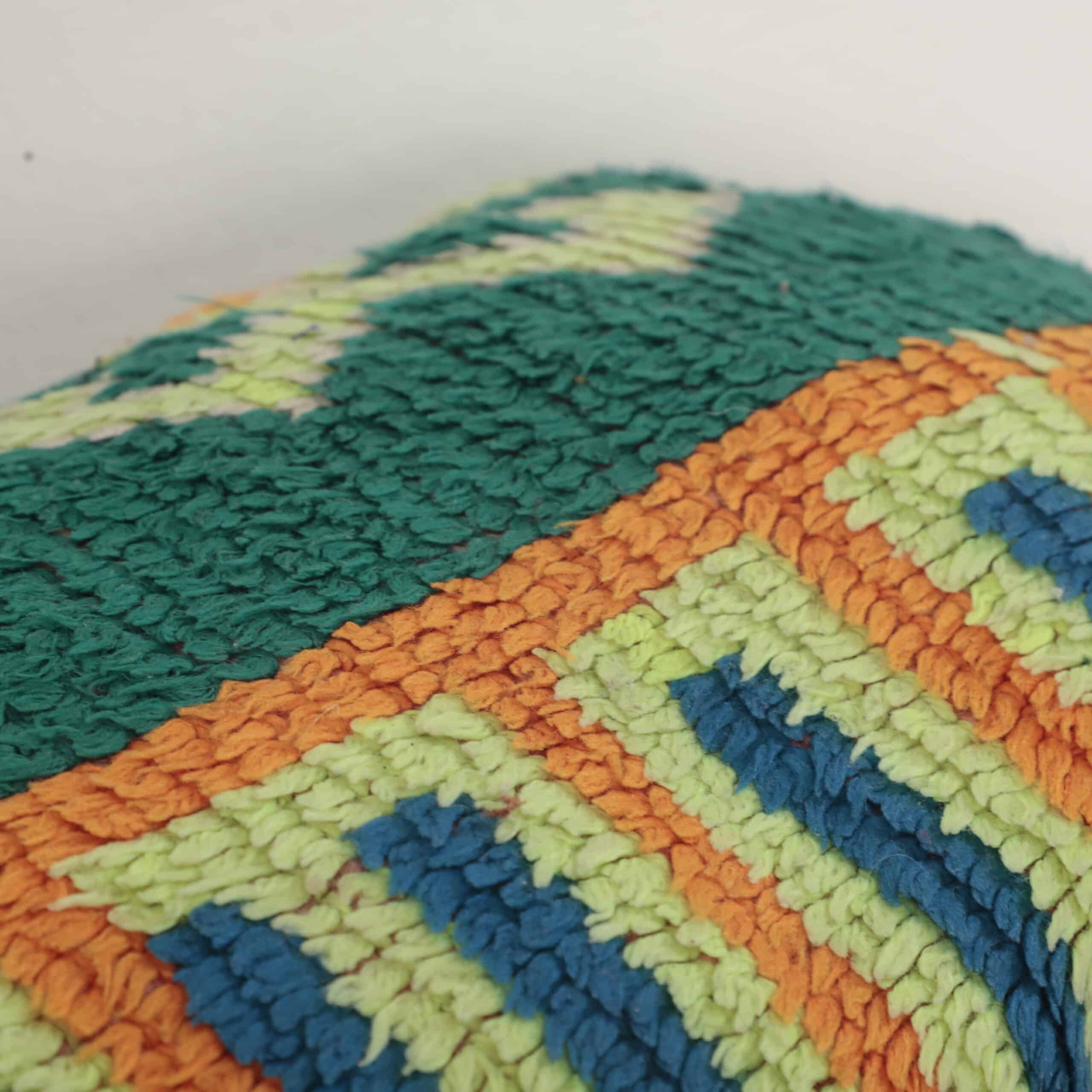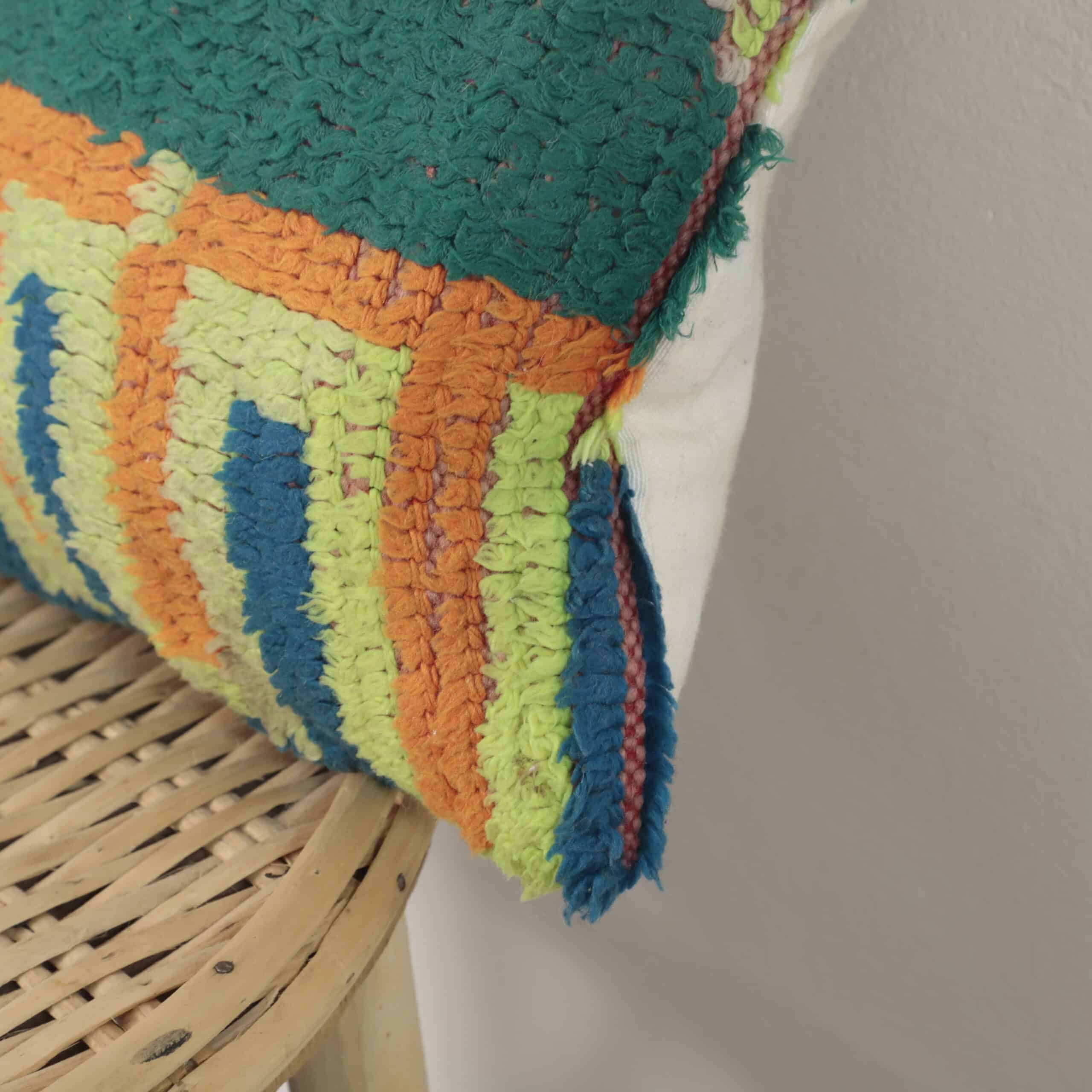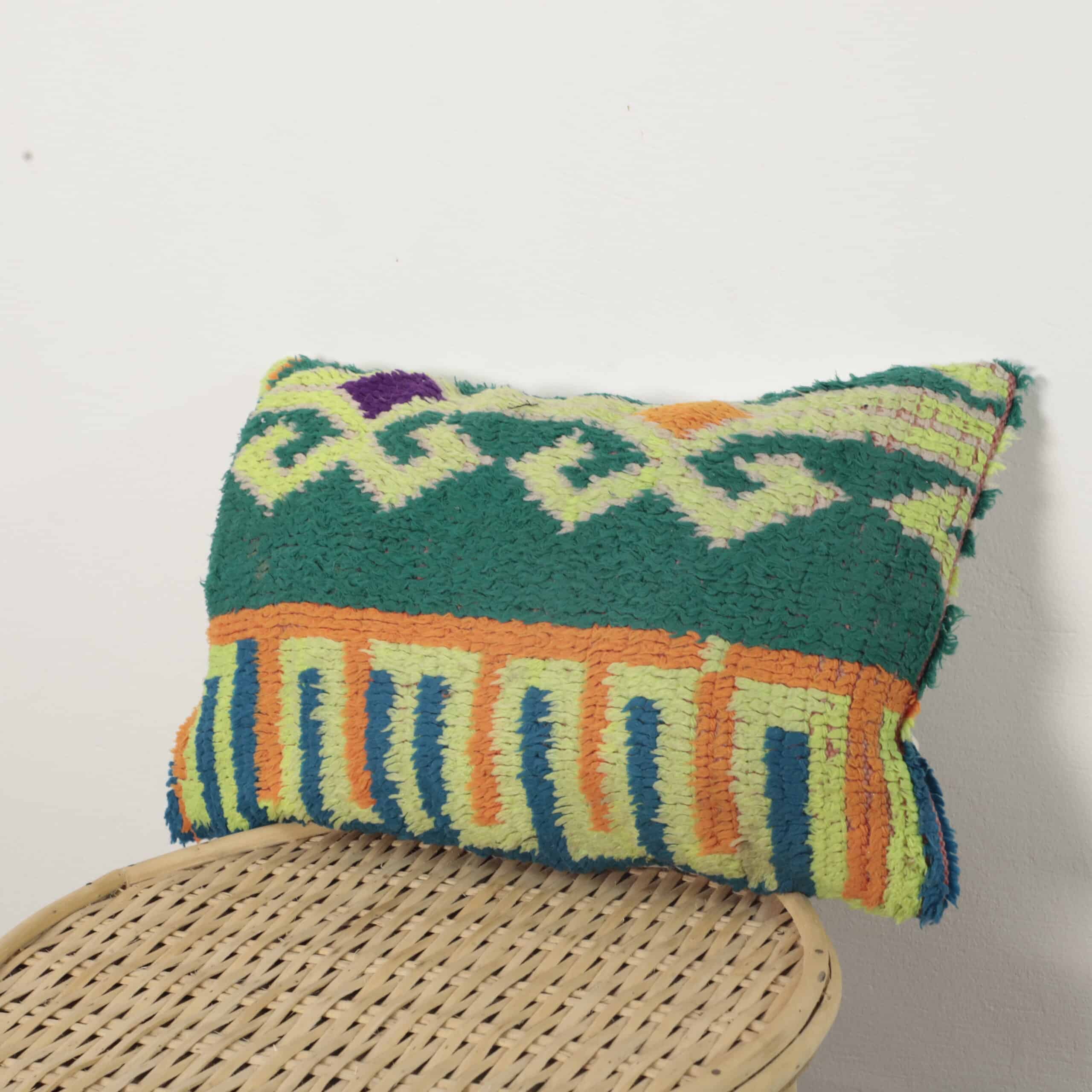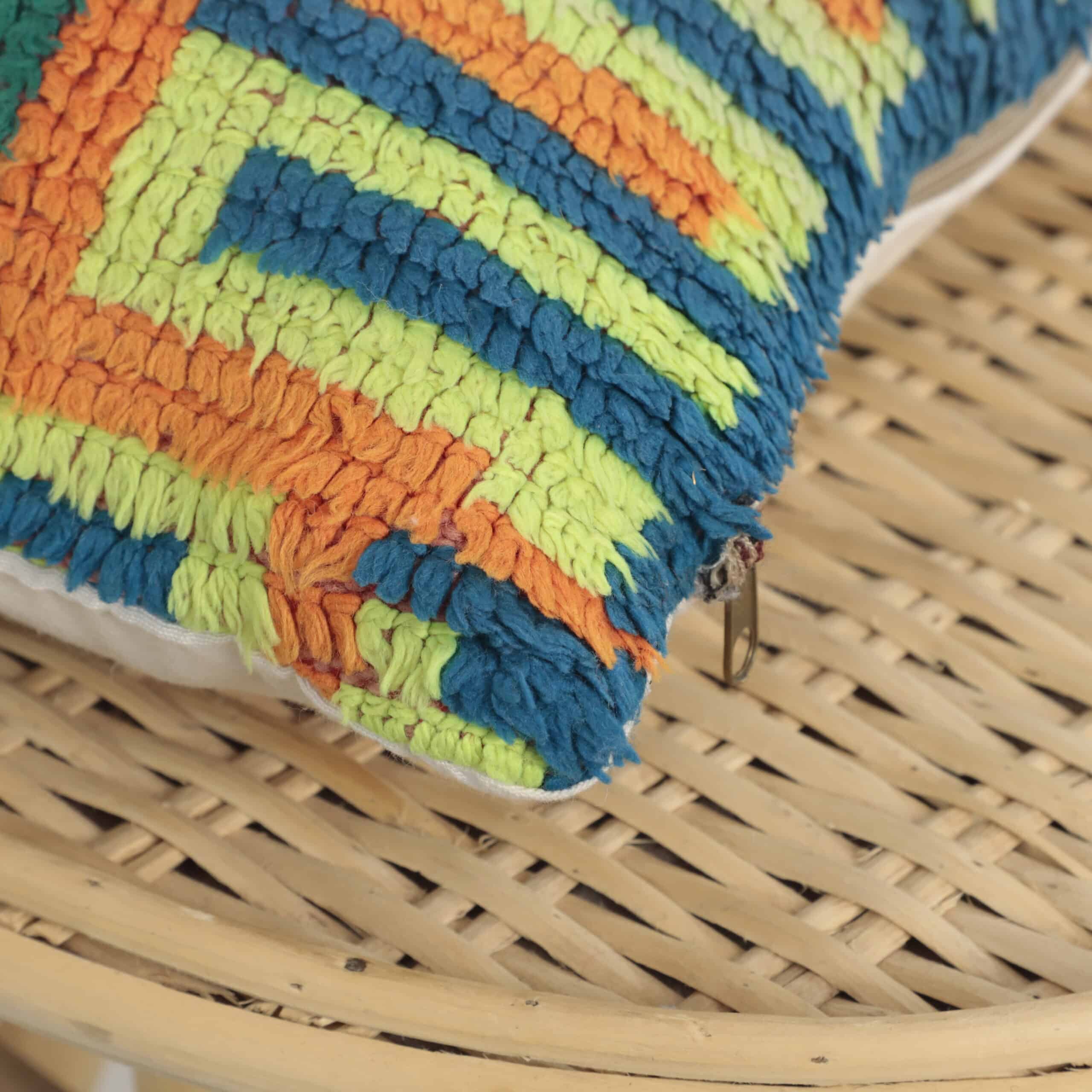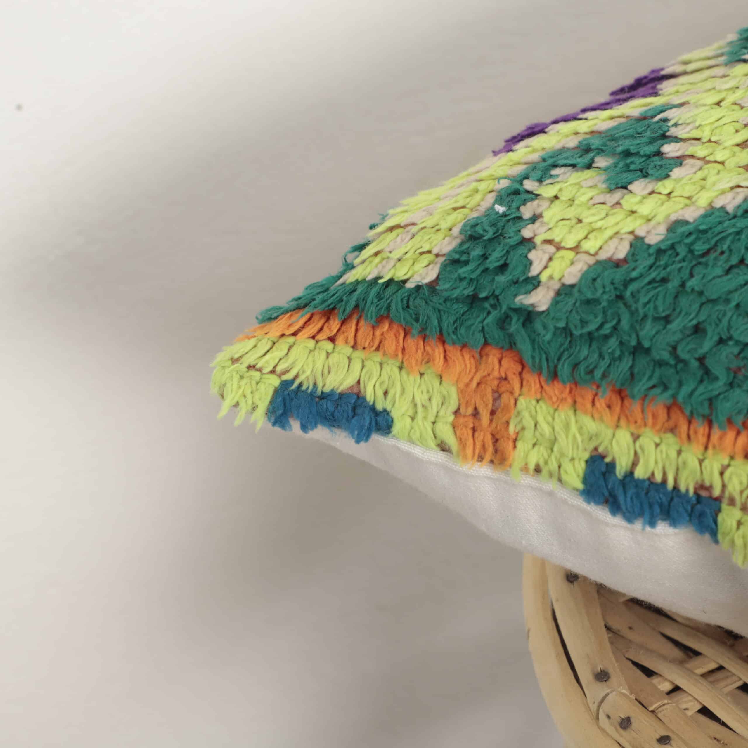 This cushion stands out with its vibrant mix of green, orange, yellow, blue, and purple — combined in a bold tribal geometric pattern that brings life, warmth, and culture into any room.